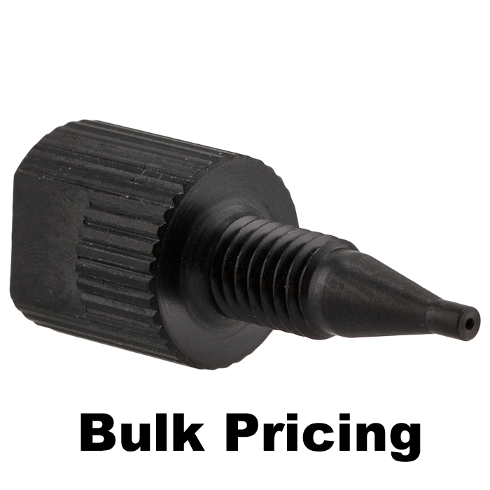 Adapter, for use with low to medium pressure HPLC. Waters female to 10-32 male connection, 0.40 mm / 0.016 bore size. Black PEEK. ARE-Applied Research brand. Bulk Price.