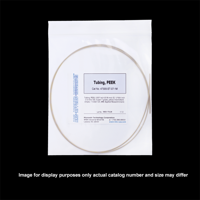 You determine the length of this Ultra-T™ grade (premium) tubing that is extruded from virgin PEEK material without any manufacturing additives. The broken yellow stripes are added only to the outside of the tubing, leaving the interior all natural PEEK which eliminates leachables due to color.