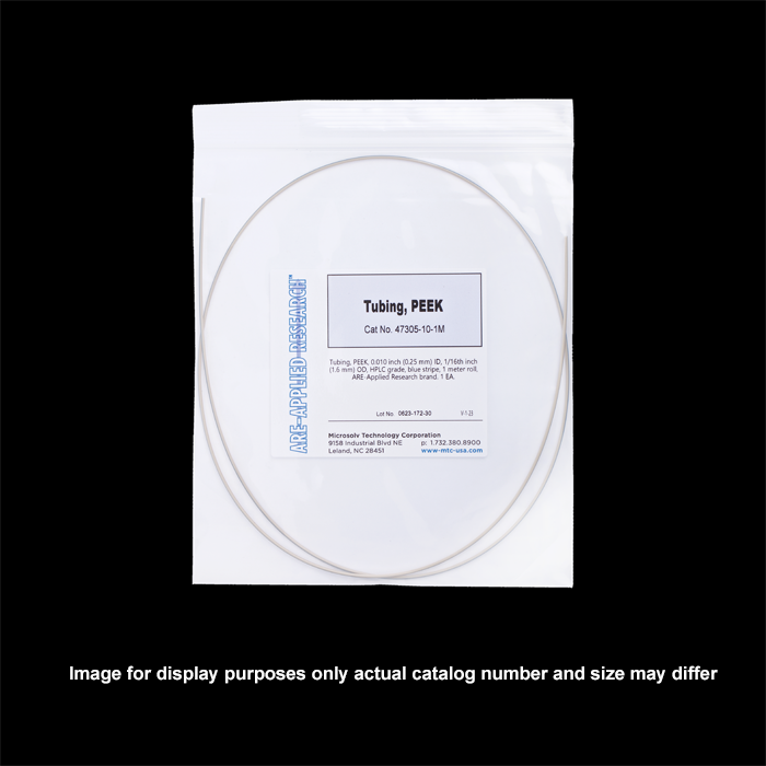 Tubing, PEEK, 0.010 inch (0.25 mm) ID, 1/16th inch (1.6 mm) OD, HPLC grade, blue stripe, Your custom continuous length tubing, priced per meter. ARE-Applied Research brand.