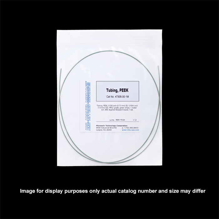 Tubing, PEEK, 0.030 inch (0.75 mm) ID, 1/16th inch (1.6 mm) OD, HPLC grade, green stripe. Your custom continuous length tubing, priced per meter. ARE-Applied Research brand.