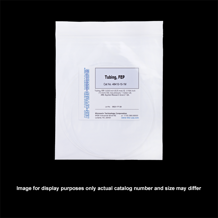 Tubing, FEP, 0.010 inch (0.25 mm) ID, 1/16th inch (1.6 mm) OD, low pressure, Your continuous length tubing, priced per meter. ARE-Applied Research brand.