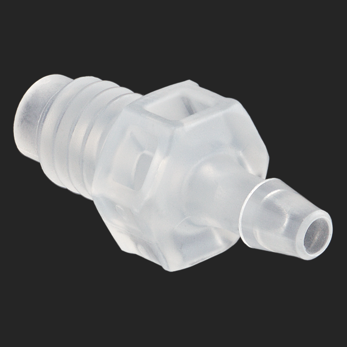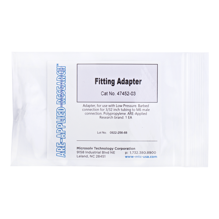 Adapter, for use with low pressure. Barbed connection for 3/32 inch tubing to M6 male connection. Polypropylene. ARE-Applied Research brand. Bulk Price.