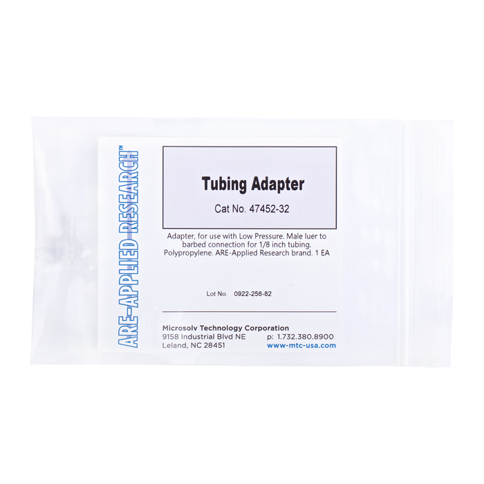 Adapter, for use with low pressure. Male luer to barbed connection for 1/8 inch tubing. Polypropylene. ARE-Applied Research brand. Bulk Price.