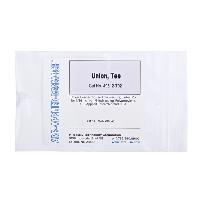 Union, connector, Tee, low pressure, 2 barbed 1/16 inch to one 1/8 tubing connection. Polypropylene. ARE-Applied Research brand. Bulk Price.