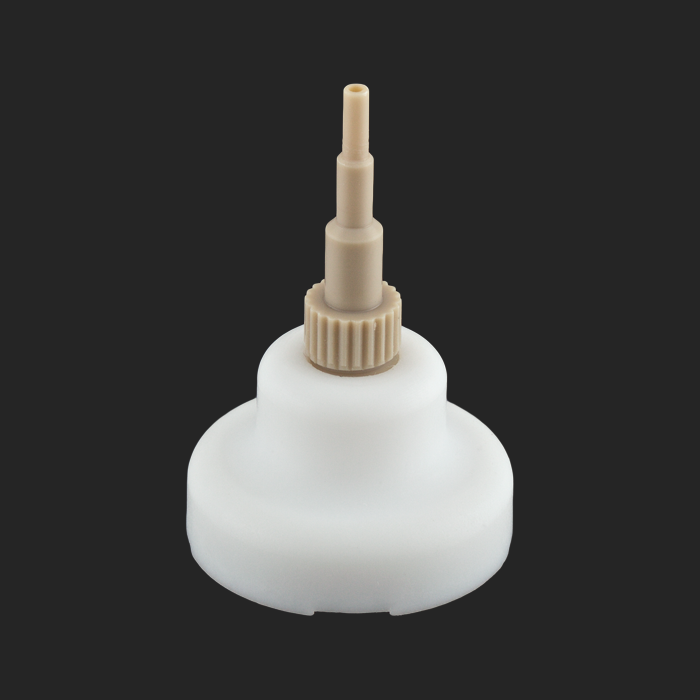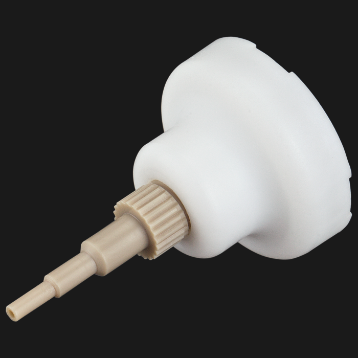 The all PEEK, tripod tubing connector allows for the inlet tubing of the mobile phase delivery system to slip over it with 1/16" or 1/8" low pressure tubing. No ferrules or nuts are required to apply tubing.