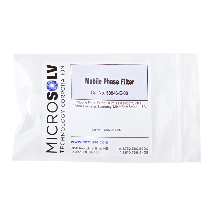 These "biocompatible" Last Drop, all PTFE mobile phase filters are manufactured with a 10 um PTFE filter element and will provide the highest filter capacity and throughput while using a maximum amount of solvent. The unique design allows for this flat filter to "vacuum" up to the "last drop of liquid" in the reservoir bottle.