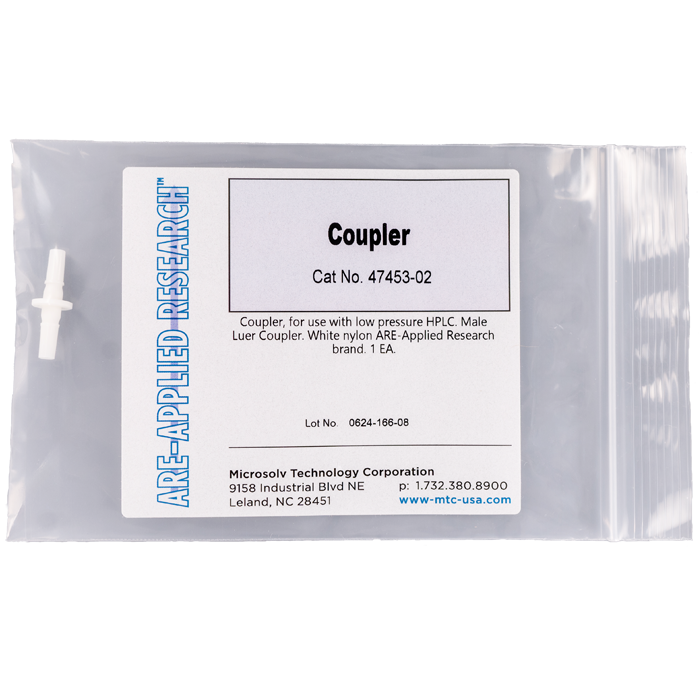 Coupler, for use with low pressure HPLC. Male Luer Coupler. White nylon ARE-Applied Research brand. Bulk Price.