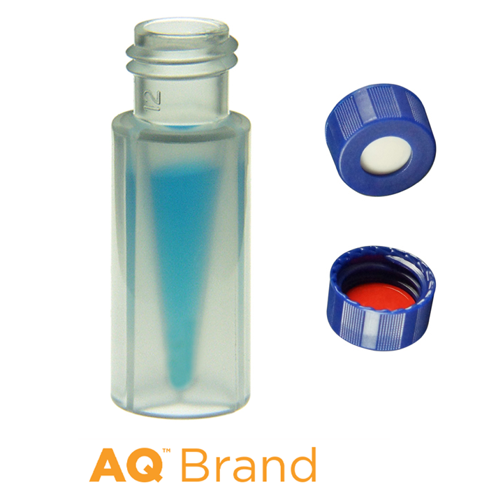 Vial & Cap Kit Includes 100 EA 300 ul, Screw top, clear polypropylene LCMS compatible autosampler vials and 100 EA matching screw caps with white silicone rubber / red PTFE Soft-Guard septa, bonded in the blue caps. AQ Brand Easy Purchase Pack. 1/PK.